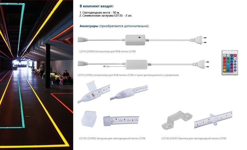 Лента светодиодная 220V 60*SMD5050, 11W/m, IP65, (RGB), в комплекте контроллер RGB (управление на контроллере) - 1шт., коннектор 2шт., заглушка 2шт., Кратность резки мм 1000мм, раб.t -25°..+50°С, бобина 50 метров*16мм*6 мм